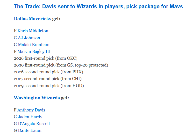 独行侠得到:米德尔顿、AJ-约翰逊、布兰纳姆、巴格利、2026年首轮签(来自雷霆)、2030年受保护首轮签(来自勇士,前20保护)、2026年次轮签(来自太阳)、2027年(来自公牛)和2029年次轮签(来自火箭)。