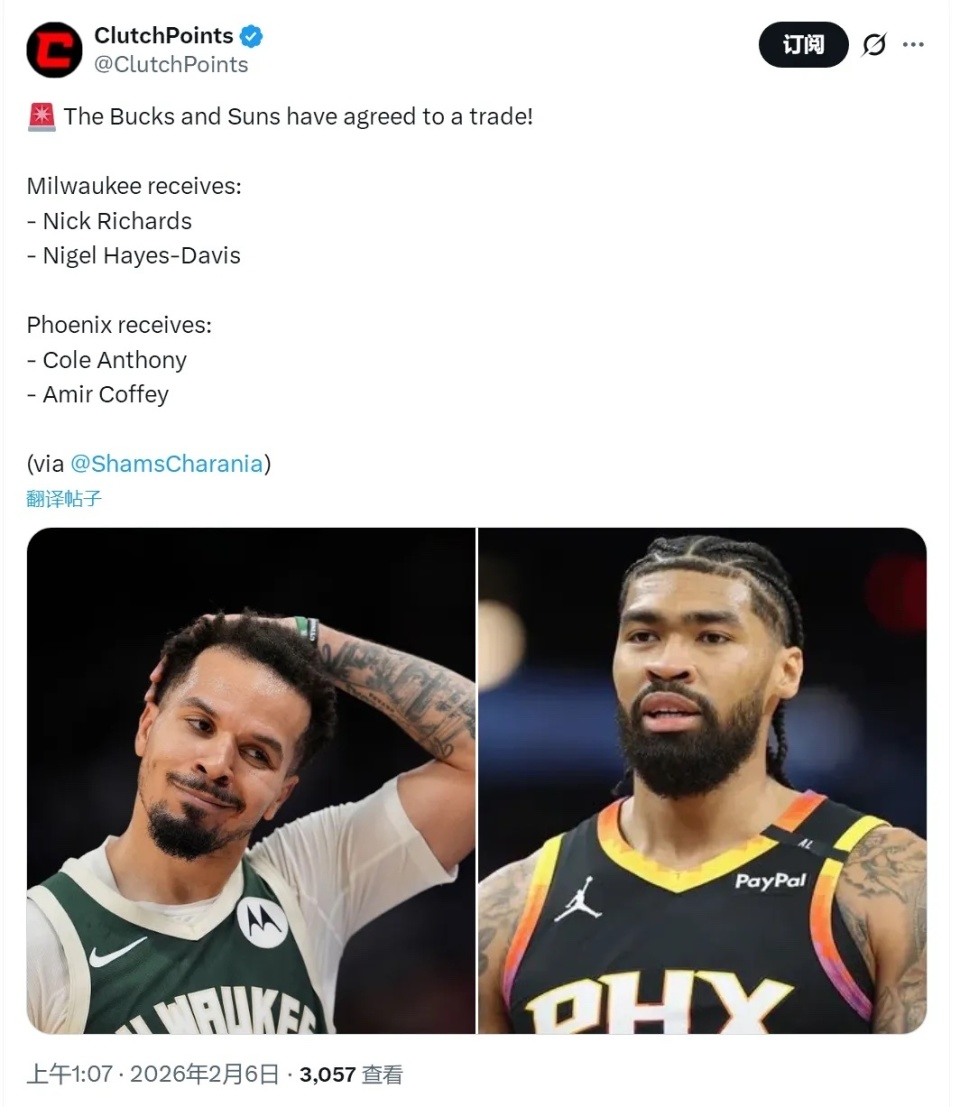 而雄鹿这边也没闲着,前脚刚官宣不交易字母哥,后脚就和太阳完成了一笔2换2的交易,把科尔-安东尼和科菲送到太阳,换回了理查兹和奈奈尔-海斯-戴维斯。这笔交易说白了就是角色球员互换,对球队的争冠前景几乎没什么影响,更像是雄鹿在戏耍全联盟之后,顺手做的一笔小修补。