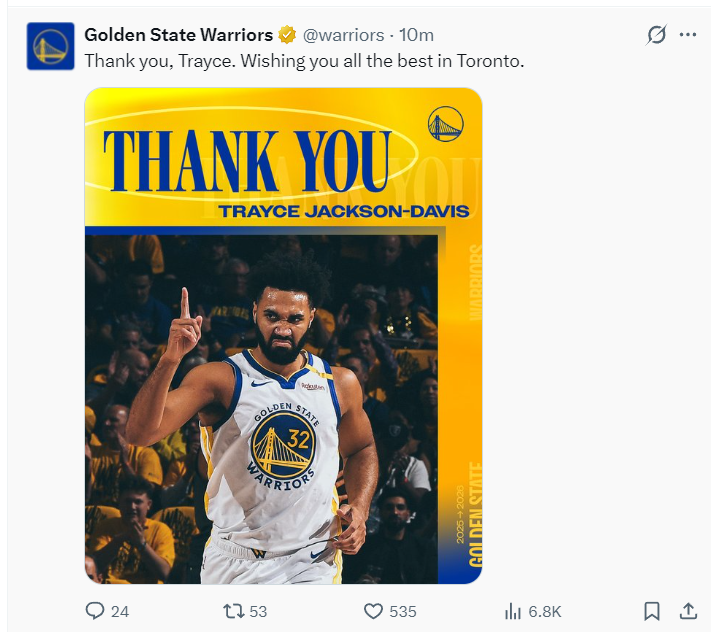 勇士官方也感谢了希尔德、库明加,这两被送到老鹰。