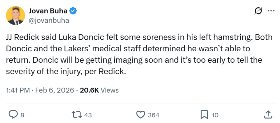 湖人官方也在半场结束时确认消息真实性,指出东契奇因腿筋酸痛本场将不会回归,确定缺席下半场的争夺。