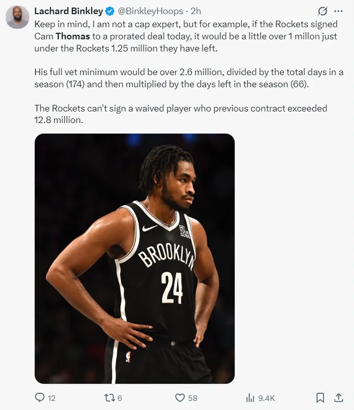 队记Binkley对此分析道,由于火箭目前仅低于第一硬帽125万美元,倘若真的要签下托马斯,那么后者的薪资最高不超过125万美元,而竞争者们能够给出更高的价钱。