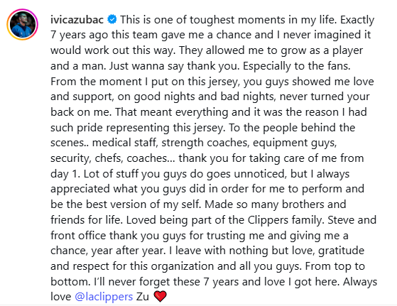 这是我人生中最艰难的时刻之一。整整七年前,这支球队给了我机会,我从未想过会以这样的方式结束。他们见证了我从一名球员到一个男人的成长蜕变。千言万语,唯有感谢。尤其要感谢球迷们。从我披上这件球衣的那一刻起,无论顺境逆境,你们始终对我倾注爱意与支持,从未离弃。这份情谊重于一切,也是我身披快船战袍时,心中满溢自豪的源泉。