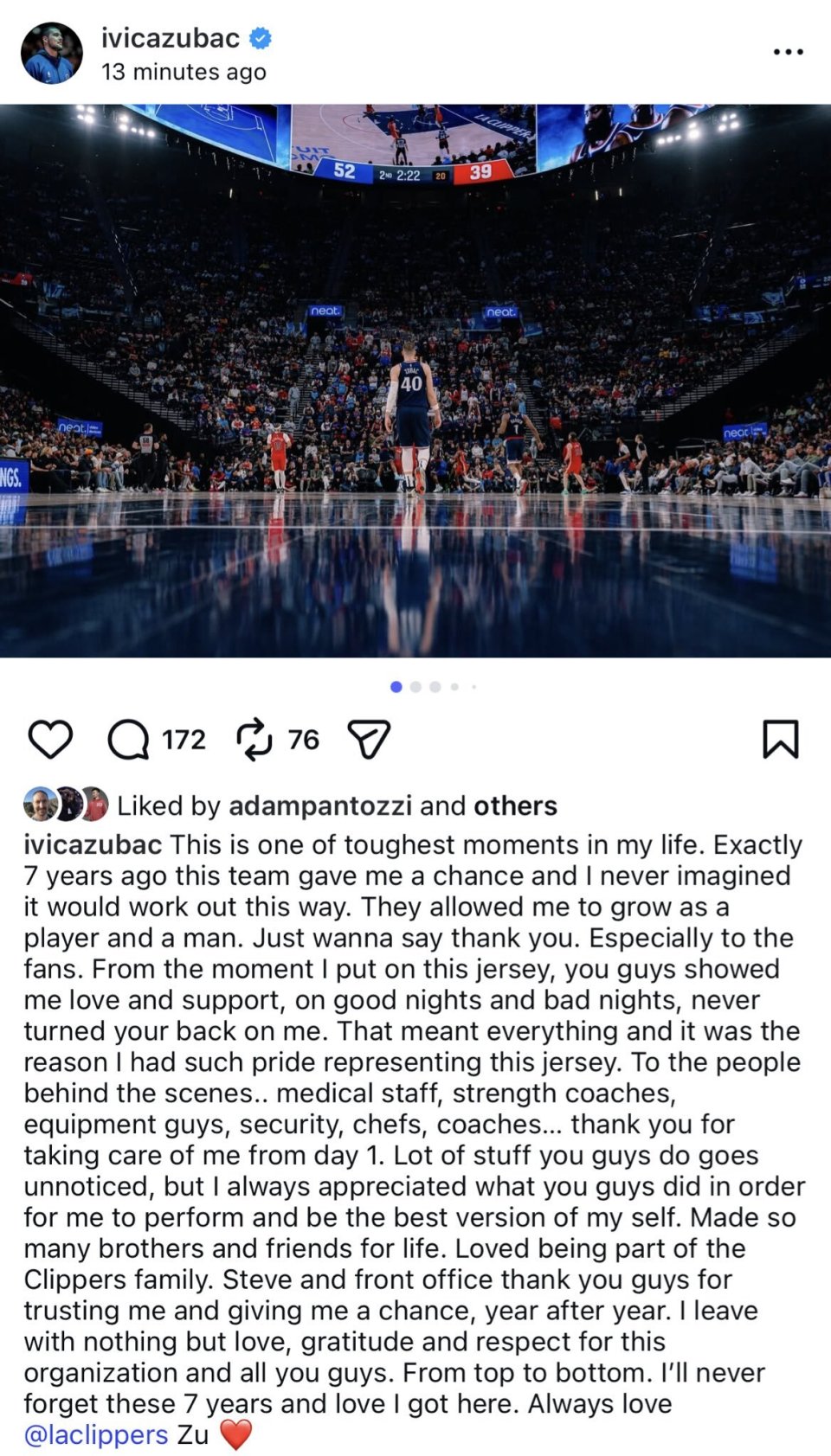 在今天早些时候,祖巴茨在社交媒体上深情告别快船队:这是我生命中最艰难的时刻之一,七年前,这支球队给了我一个机会,我从未想过一切会以这样的方式展开。他们让我作为一名球员和一个人不断成长,我想说一声谢谢。尤其要感谢球迷们,从我穿上这件球衣的那一刻起,无论表现好坏,你们始终给予我爱与支持,从未背弃过我,这对我意味着一切,也是我身披这件球衣时如此自豪的原因。
