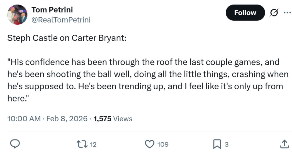 除此之外,卡斯尔称赞了另外一名新星卡特布莱恩特,直言自己感觉到了他在过去几场比赛信心爆棚,不仅投篮手感火热,细节也做得很到位,他的状态一直在提升,显然会越来越好。
