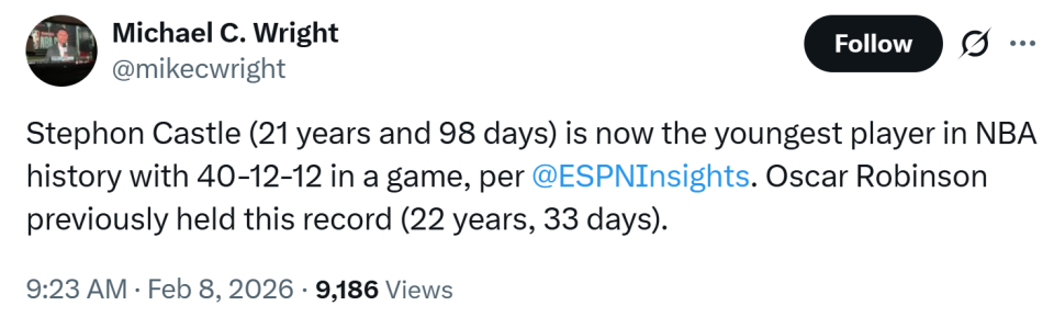 同时卡斯尔才21岁零98天,这让他打破此前由大O(22岁33天)保持的历史纪录,成为NBA历史上单场拿到至少40分12板12助最年轻的球员。