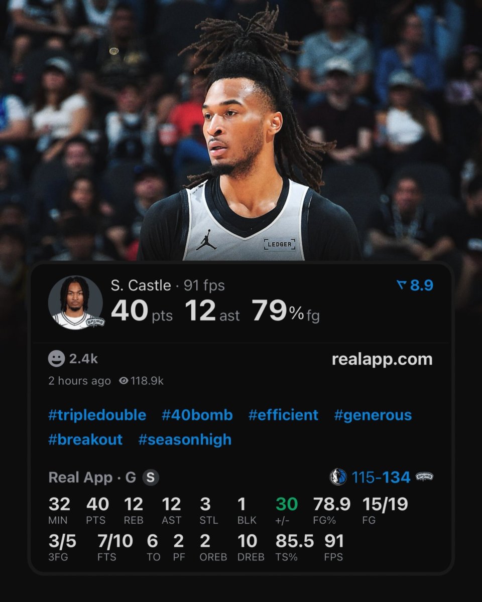 狂轰40分12板12助超级大三双,4号秀卡斯尔牛马大战刷爆纪录抢戏文班!马刺队4大新星齐暴走天赋溢出。