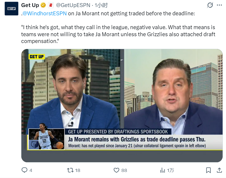 北京时间2月7日,ESPN名记Brian Windhorst在节目中,谈及灰熊为何没能送走莫兰特:“很多人都说莫兰特毫无价值,但我觉得这个说法并不准确。因为我认为他现在就是负资产,除非灰熊倒贴选秀权,否则没有球队愿意接手。”