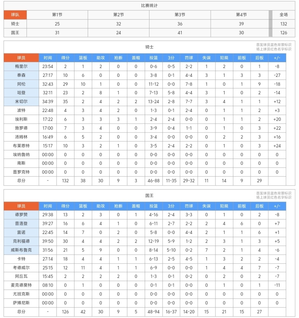 首节比赛哈登3次出手都没有打进,不过有3次助攻进账,米切尔也是手感不佳,只拿到了2分,梅里尔也是哑火了,阿伦和泰森打得不错,替补席的布莱恩特登场后连拿8分,国王队的进攻显然打得更好,威斯布鲁克、克利福德、普罗登都火力全开,第一节比赛骑士25-31落后国王!