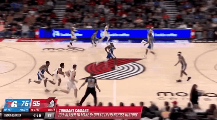 卡马拉本场比赛打出超强进攻效率,全场投篮12中10,三分10中8,正负值高达+30。卡马拉刷新生涯单场得分和三分命中数纪录,率队在第三节狂飙49分碾压76人,成功助力开拓者获得比赛胜利。