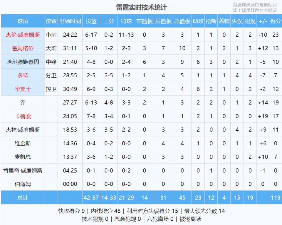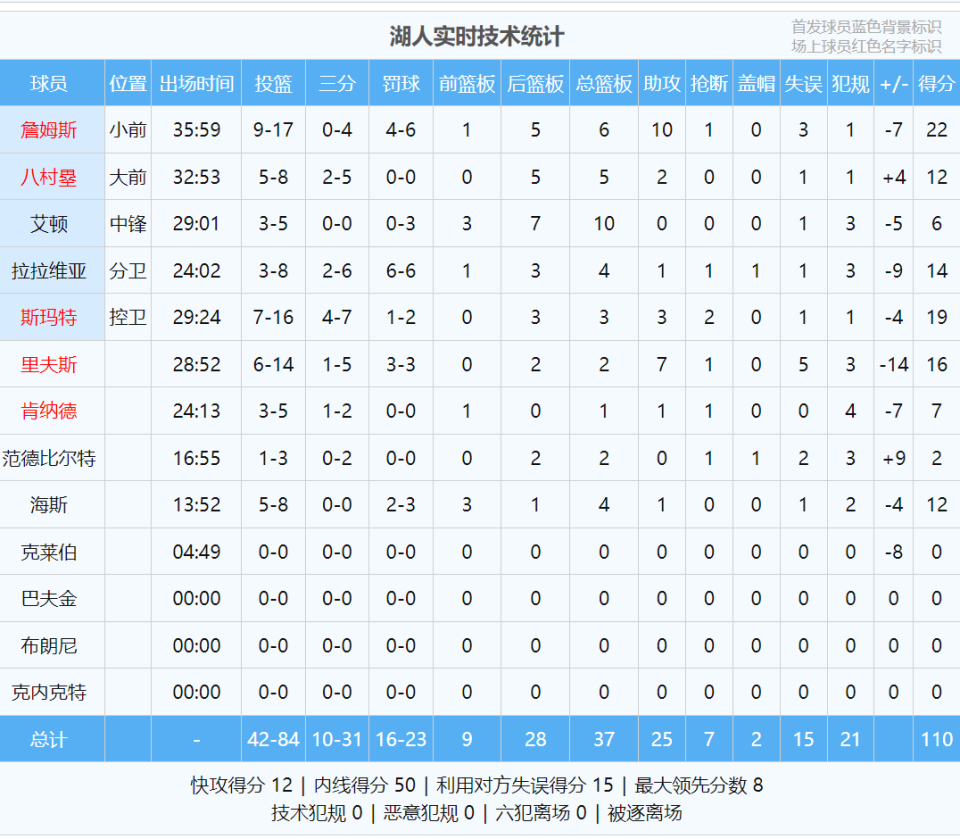 全场结束,湖人110-119不敌雷霆,明天湖人背靠背对阵西部第二的马刺。里夫斯首节4中4,后三节8中2,全场14中6砍下16分2篮板7助攻5失误。詹姆斯17中9,得到22分6篮板10助攻3失误。杰威得到23分,以赛亚-乔砍下19分。