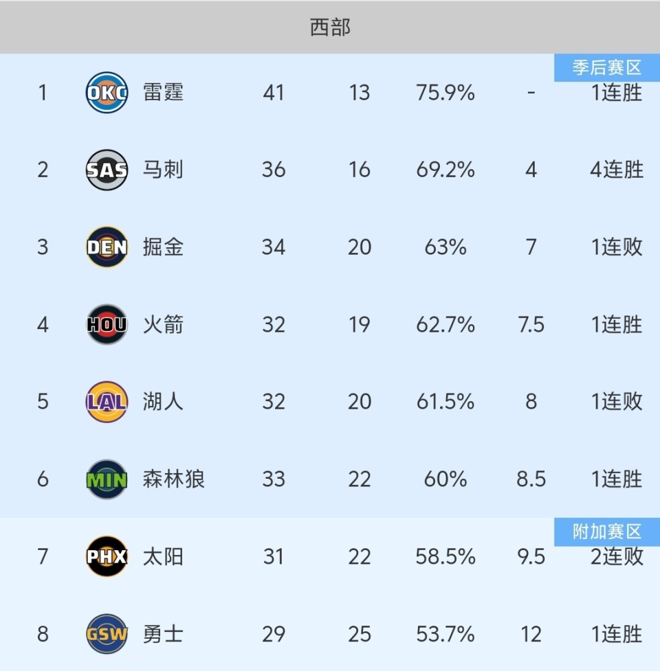 随着湖人110-119残阵雷霆、掘金被绝杀,NBA最新积分榜:火箭利好!