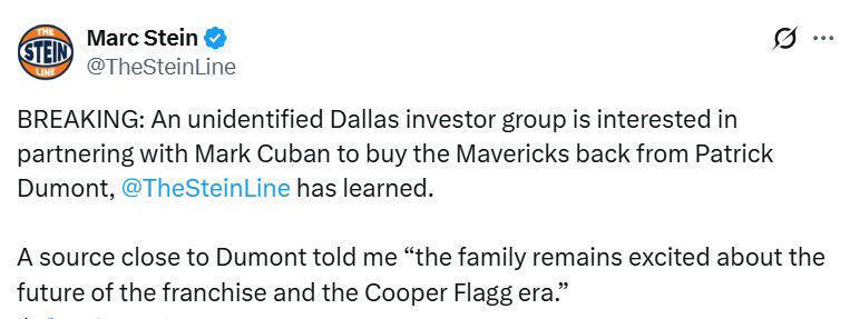 据名记Stein报道:一个未公开身份的达拉斯投资集团有意与马克-库班合作,从帕特里克-杜蒙特手中回购独行侠队。没有看错,就是要重新拿回独行侠的控制权,想到出库班以35亿的价格抛售,让他赚得盆满钵满,可是没过多久就在节目中哭诉自己的不容易,当初经营独行侠亏了几亿美元,23个赛季就两年赚钱。然而,还没有3年的时间就后悔了。然而,目前最大的问题并不是多少钱能够收购,而是杜蒙家族有极大地可能性拒绝出售部分球队股份,所有的“症结”都出现在弗拉格的身上。