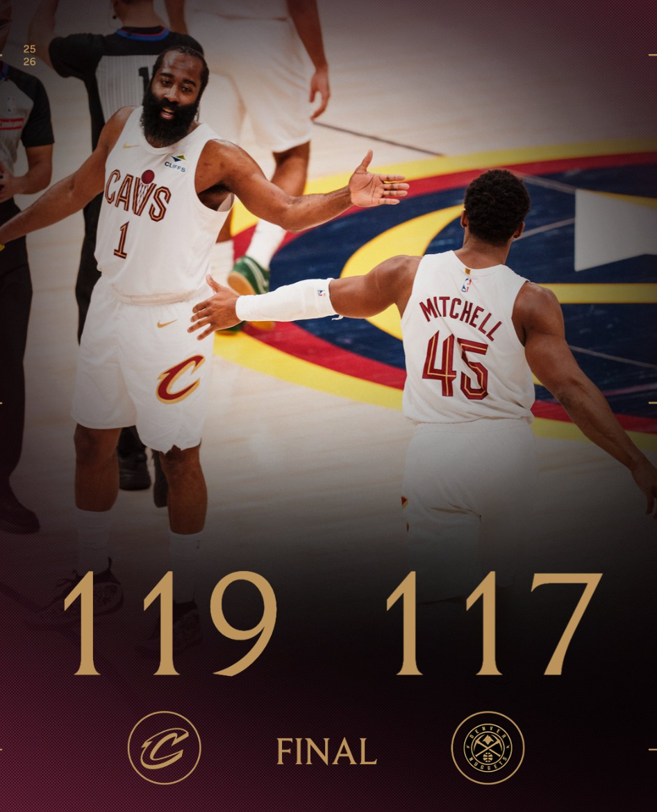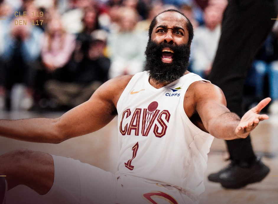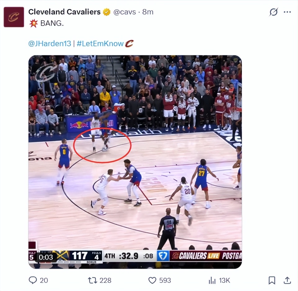 这场比赛詹姆斯-哈登再度成为克利夫兰的超级英雄,在上一场对阵国王的末节他连续命中关键三分,末节4中4拿到15分(7分钟),而这场比赛对阵联盟顶级豪强掘金,哈登在末节又用三分球帮助骑士续命。