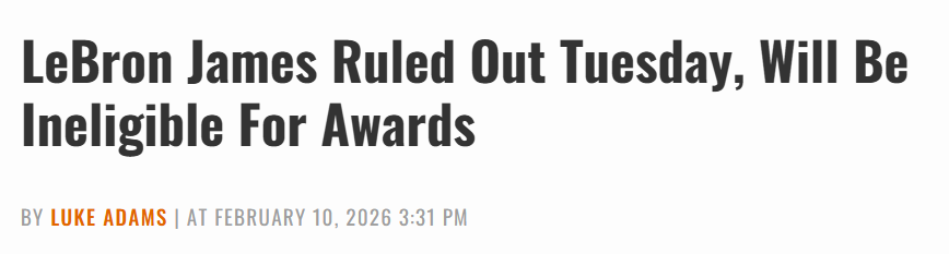 詹姆斯的缺阵是其中最受关注的一点,这将是他本赛季缺席的第18场比赛。这意味着他本赛季将无法达到65场的出场门槛,而这是球员有资格竞争赛季末各大奖项的最低要求。