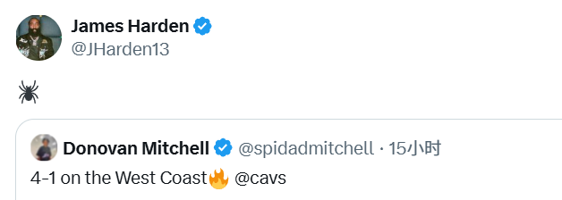哈登在末节10分钟里得到6分4篮板4助攻。过去两场比赛,骑士第四节的进攻效率高达142.0。赛后,哈登转发了米切尔的庆祝胜利的社媒,配上了蜘蛛的表情,而那正是米切尔外号(蜘蛛侠)的标志。