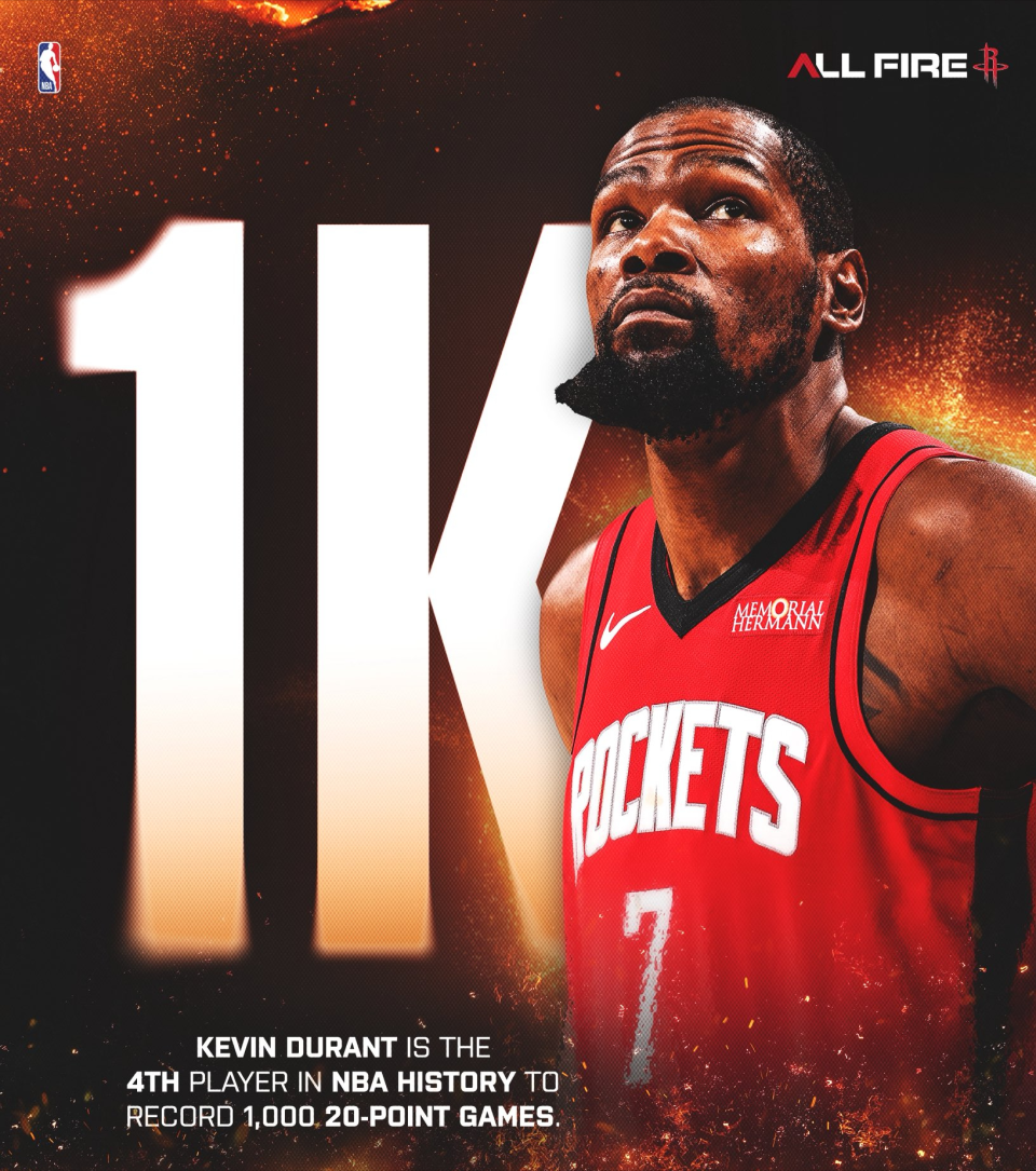 凭借这样的表现,杜兰特迎来里程碑,成为NBA历史上第4位拿下千场20+得分表现的球员,前三人分别是詹姆斯、卡尔马龙和贾巴尔。