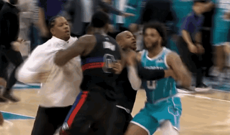 本以为事情就此平息。但是布里奇斯试图为迪亚巴特出头,布里奇斯主动推搡杜伦想要再次上演全武行。活塞替补席的斯图尔特彻底坐不住,直接冲上赛场想要为杜伦撑腰,场面再次乱作一团。斯图尔特上蹿下跳地朝着布里奇斯挥拳。眼看事态严重,更多的工作人员涌入赛场上前拉开两人,尽快将两人保在安全距离,事情才告一段落。