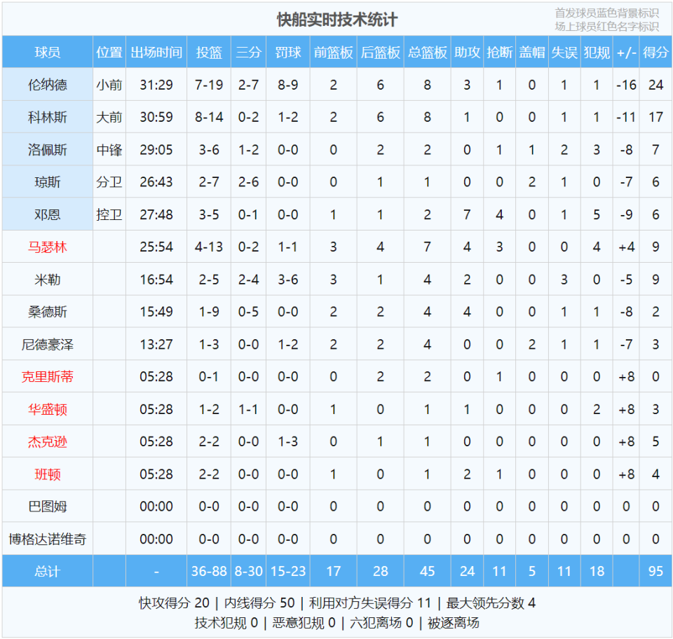 杜兰特22中8得26分6板3断5失误,申京14中9拿到22分7板5助3失误,谢泼德10中6拿到16分6板4助4失误。伦纳德19中7得24分8板3助1断,连续32场砍下20+。马瑟林13中4拿到9分7板4助3断,手感一般,但是在场上活力十足。