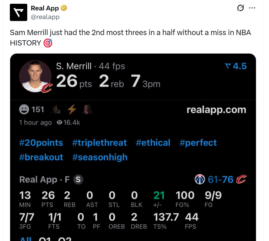 并且半场比赛梅里尔三分7中7也打破NBA历史纪录,并列NBA历史第二多,仅次于布伦森(8记)。