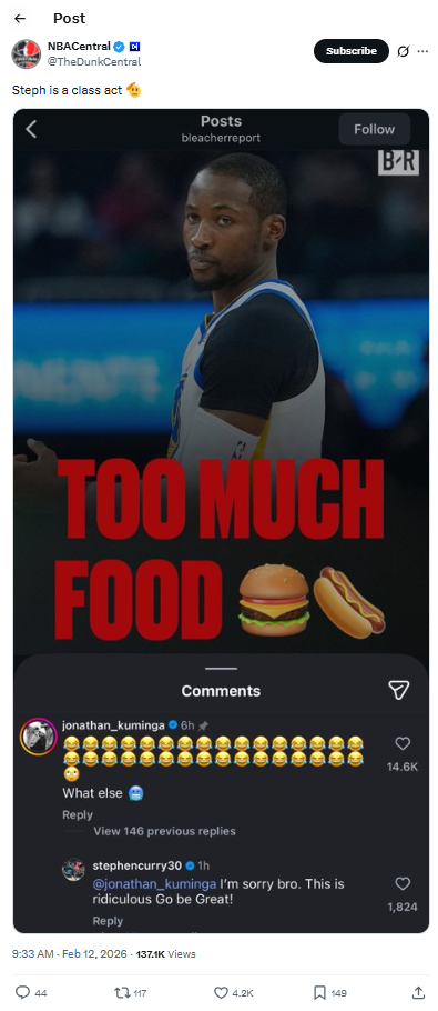 虎扑02月12日讯 根据此前报道,库明加被批缺席勇士球队活动,还被提醒家属室拿太多食物。