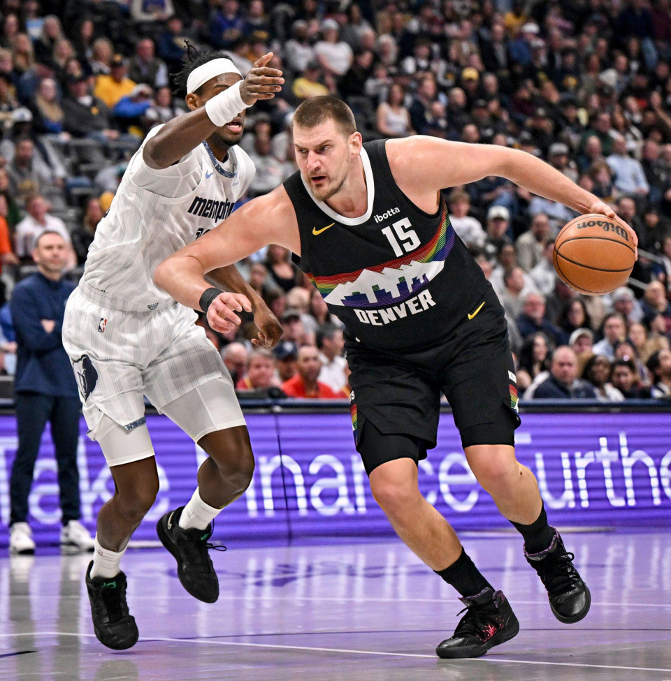 首节比赛中,约基奇便连续攻击灰熊队的篮下,单节7投4中拿到9分,同时抢到5个篮板送出5个助攻。次节比赛中,约基奇仅出场4分钟,两投全丢仅靠罚球得到2分。进入第三节比赛之后,约基奇找回手感,他连续篮下得手,并且多次造犯规命中罚球,单节8分6板5助攻达成三双。末节比赛中,掘金队一度遭遇灰熊队追分,约基奇重新上场后稳住局面,连续造犯规命中罚球,并篮下强攻得手,帮助球队最终取胜。