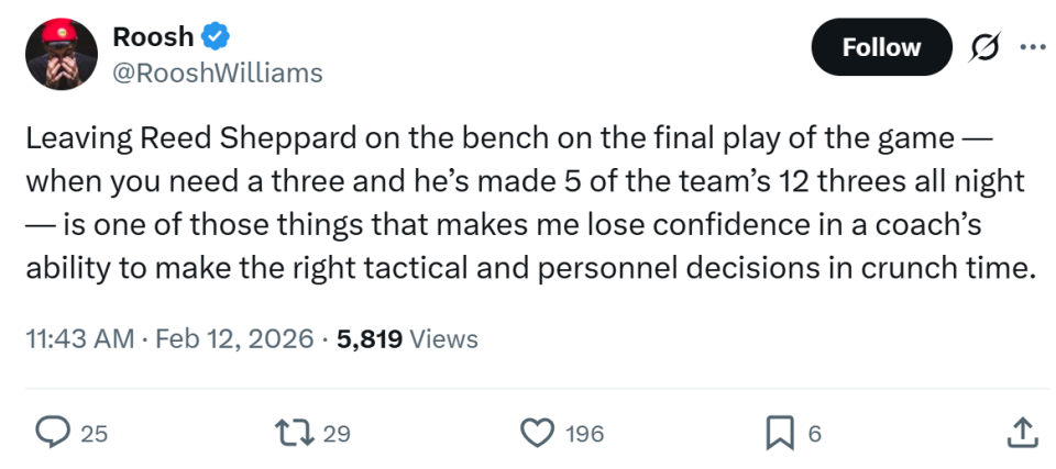 RooshWilliams写道:“当球队关键时刻落后3分时,乌度卡将整晚命中了全队12记三分球中5个的谢泼德摁在板凳席,这种决策让我对教练在关键时刻做出正确战术和人员调整的能力失去了信心。”