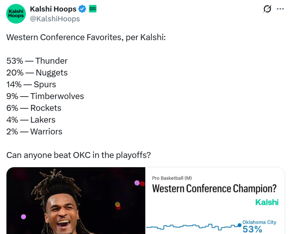 火箭队6%仅排第五!在常规赛程过半,全明星周末即将到来之际,西部冠军概率更新出炉,其中湖人4%、勇士2%、掘金20%屈居第二,雷霆超5成断档第一。