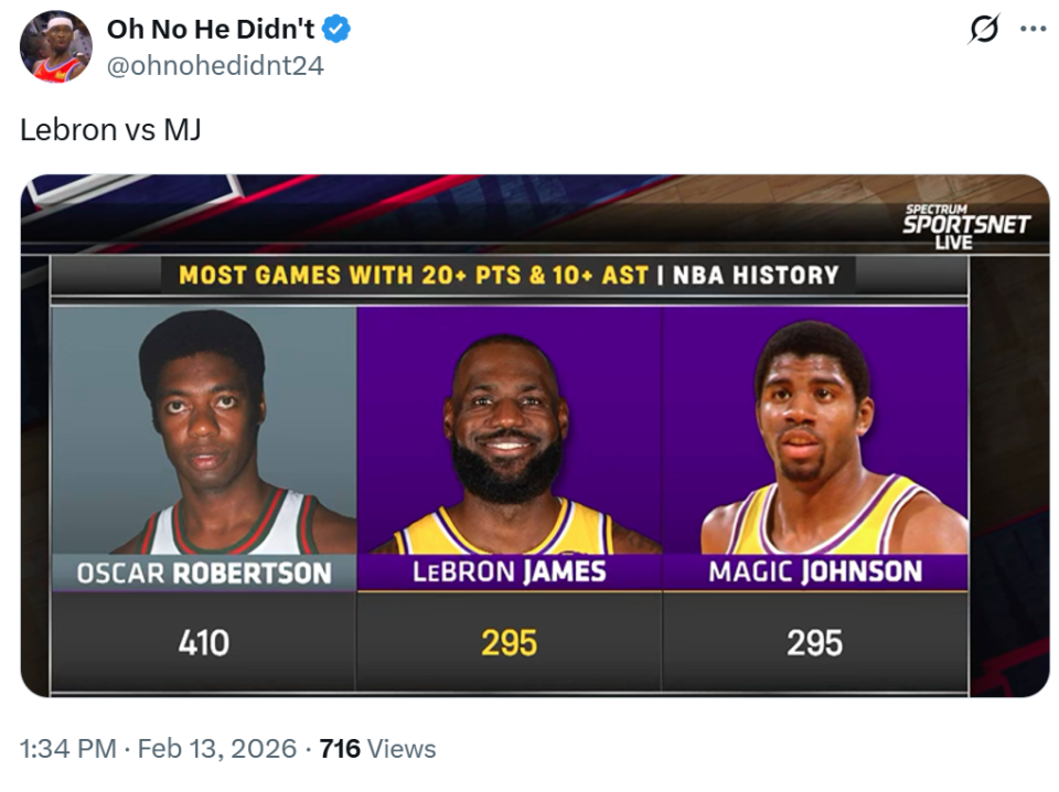 纪录三:本场是詹姆斯生涯第295次单场至少交出20分10助,成功追平魔术师约翰逊并列NBA历史第二,大O以410次高居历史第一。
