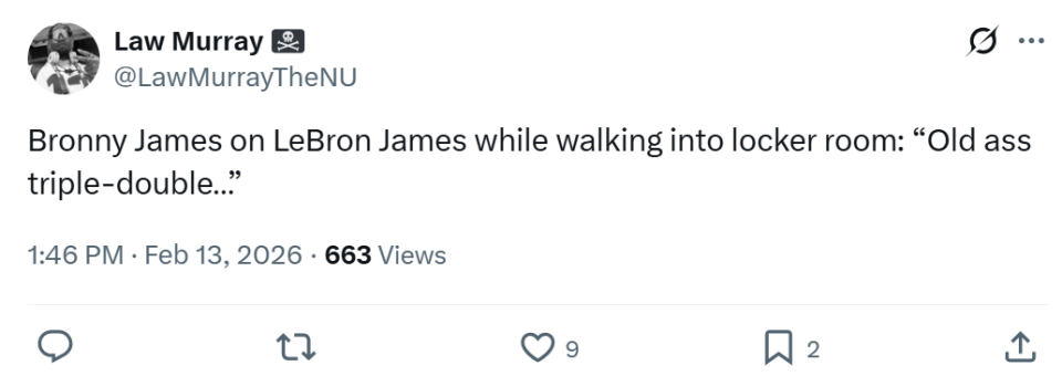 儿子布朗尼也在赛后更衣室中对父亲詹姆斯说道:“老家伙的三双(Old ass triple-double)。”