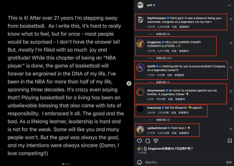 送上祝福的还有霍福德、小佩顿、TJD、前NBA球员昆汀-理查德森、迈克尔-芬利等人。同时,杜兰特、亚历山大、布克、利拉德、德罗赞、追梦格林等多位球星都在保罗的退役宣言中点赞,一切皆在不言中,这都是保罗21年来与他共同搭档或同台竞技所留下的美好瞬间。