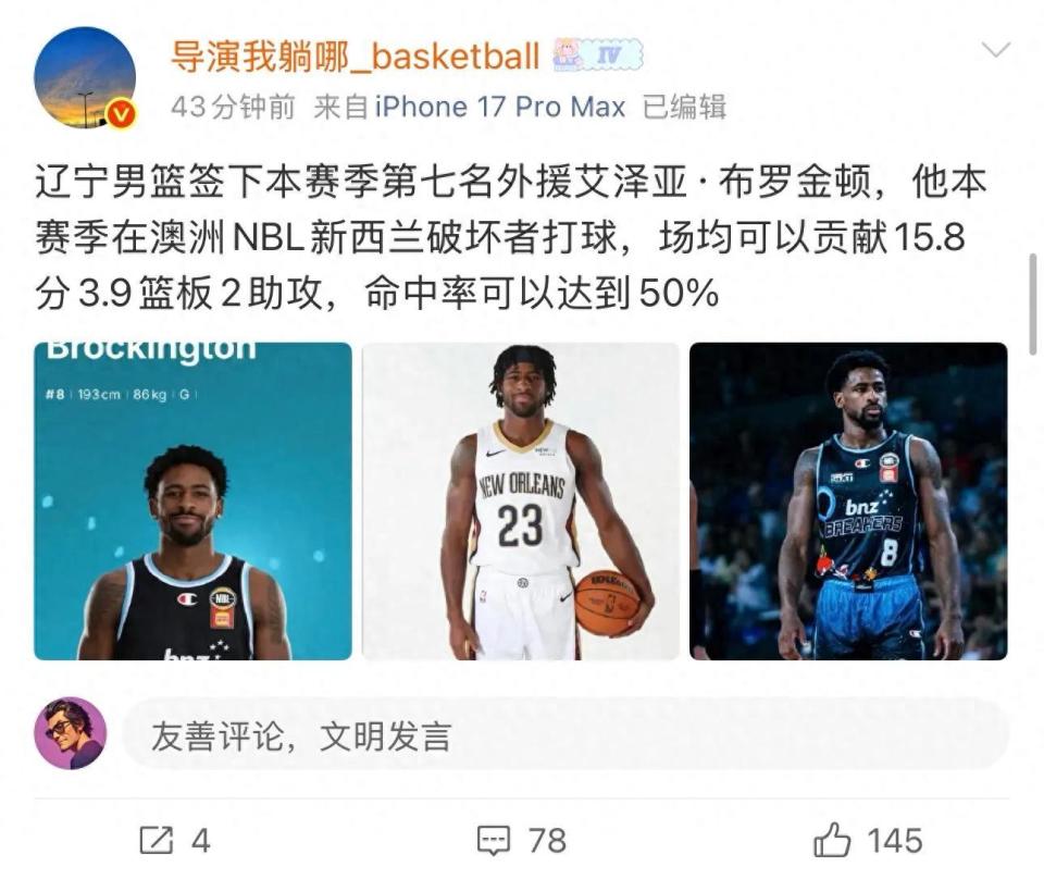 加盟辽宁之前,布罗金顿效力于澳大利亚NBL联赛新西兰破坏者队,场均可以贡献15.8分3.9篮板2助攻,命中率可以达到50%,还上演过隔扣麦基的名场面!舍不得孩子套不着狼,辽宁终于签下了一位高水平外援,即战力非常强!CBA其实就是靠外援的联赛,只需要一名超级小外援就足够,可以起到以点带面的效果。第二阶段才是真正的竞争,很多俱乐部都补强了外援,希望辽宁在第二阶段可以提高排名,确保进入季后赛。