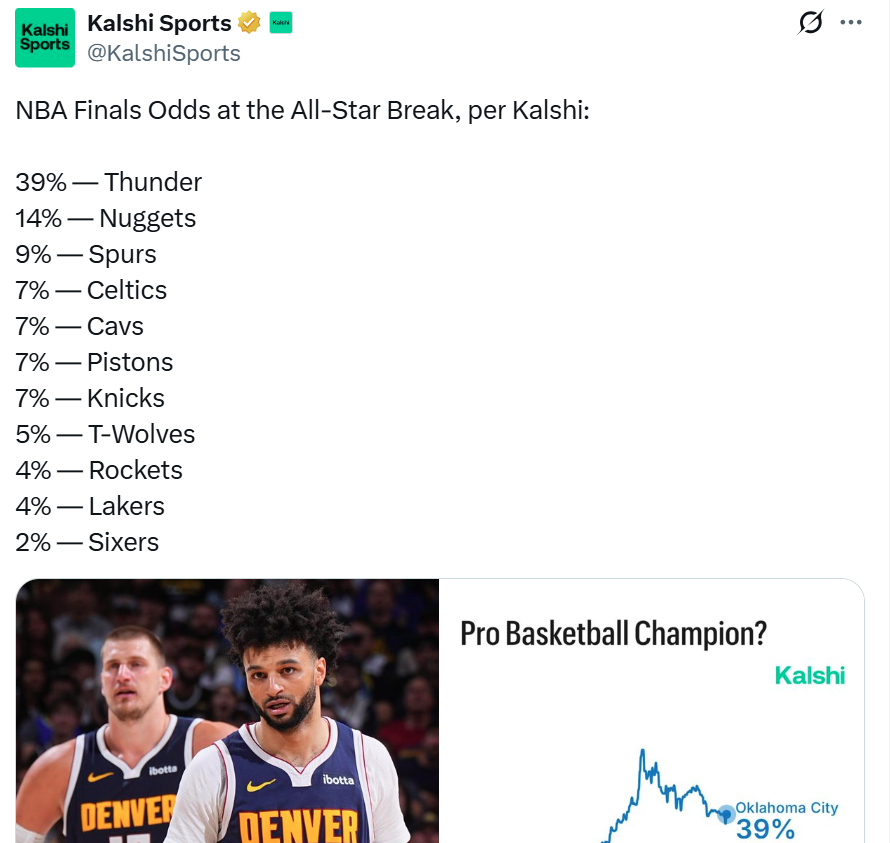 雷霆队以39%的夸张概率断档排在第一名,结合实际比赛内容、人员配置、教练组水平、管理层掌控力等多重因素来评价,卫冕冠军雷霆的确值得被看好。