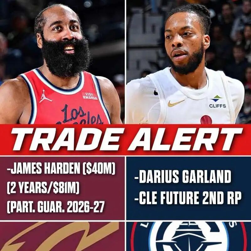 今年交易截止日之前,骑士进行了多笔交易:1、将朗佐-鲍尔和2个次轮签送至爵士;2、将加兰和1个次轮签送到快船,2换1交易得到哈登;3、三方交易送出德安德烈-亨特和1个次轮签,2换2交易得到基恩-埃利斯和丹尼斯-施罗德。