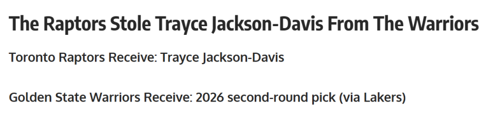 这是一笔典型的低价捡漏型交易,猛龙队仅花费一枚次轮签就从勇士拿下TJD这名合格的替补内线。
