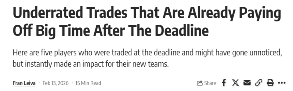 美媒认为5笔被低估的小手笔交易已经开始发力!湖人2换1拿下神射,勇士旧将1换1赴猛龙获重生,火箭队错失补强1号位捡漏良机。