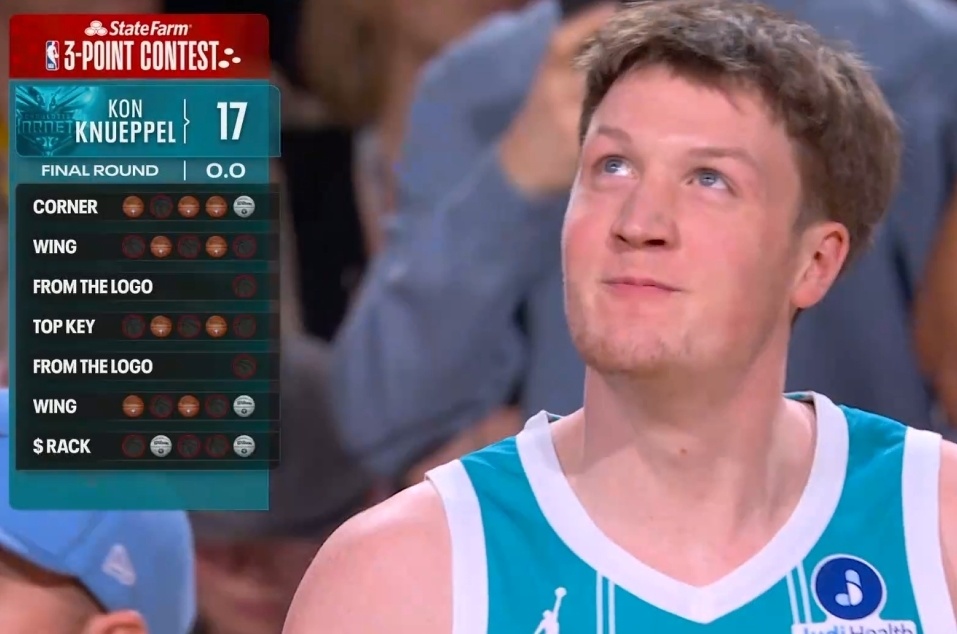 进入决赛比拼,黄蜂新秀克努佩尔率先登场,他第一个点命中4球包括花球,左侧弧顶5中2,随后超远球不中。克努佩尔中路弧顶也只命中2球,超远球继续不中,右侧弧顶命中3球,最后一个弧顶花球只命中2球,最终只得到17分远逊色于预赛的发挥。