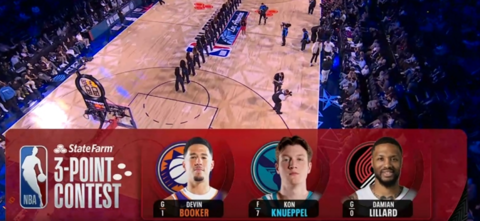预赛比拼,第一位登场的是黄蜂新秀克努佩尔,他在第一点命中3球包括花球,第二个点命中3球,随后超远球不中,中路弧顶命中4球,随后右侧弧顶超远球。克努佩尔之后侧翼5连中手感火爆,底角命中3个花球,成功得到27分表现出色。