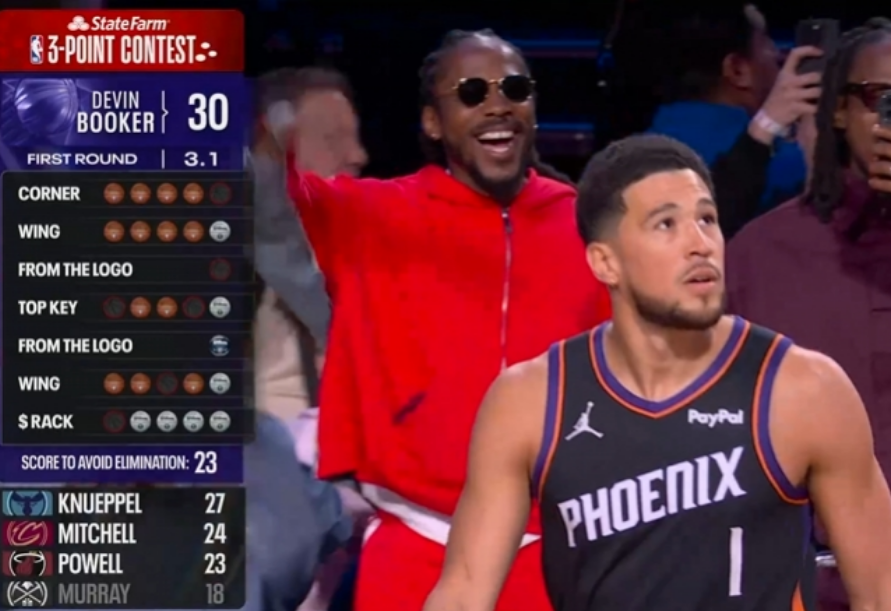 第七位登场的是卫冕冠军布克,他第一个点命中4球,左侧弧顶5中5表现出色,但随后超远球不中。布克中路命中3球,右侧超远球也不中,右侧弧顶命中4球,最后花球点再中4球,布克得到30分表现出色。