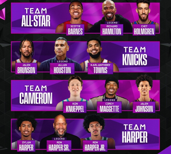 尼克斯队第四位登场,布伦森、唐斯携手队史名宿阿兰-休斯敦出战,他们前几个点表现出色连续得分,右侧弧顶接连打铁,中路唐斯命中,底角中距离阿兰-休斯敦命中,中圈四分点唐斯与布伦森连续进球,尼克斯队得到31分,携手24分的卡梅隆队晋级决赛。