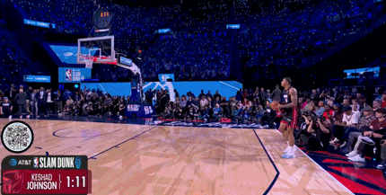 凯沙德-约翰逊很兴奋,每次扣成之后都要尬舞一番,但现场的观众兴致不高。决赛第二扣,约翰逊选择了海斯同款的罚球线内一大步扣篮,这次评委给了47.8分。卡布只需要拿47.4分就能夺冠,结果他多次扣飞,最后只拿到43分。