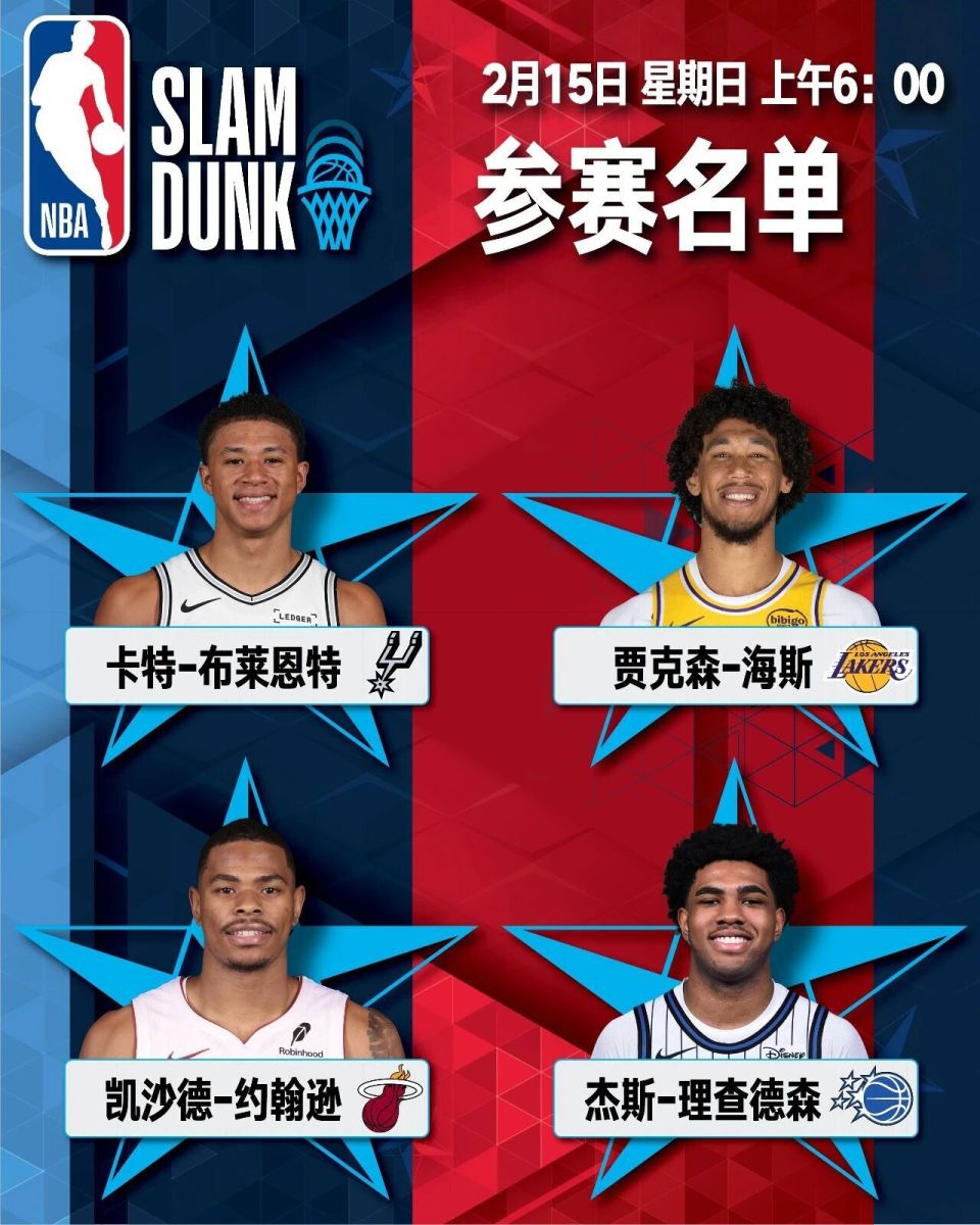 北京时间2月15日上午8点,全明星扣篮大赛正式开始。跟往年相比,今年扣篮大赛可以说星光黯淡:贾克森-海斯(湖人)、卡特-布莱恩特(马刺)、凯沙德-约翰逊(热火)和魔术的杰斯-理查德森(两届篮王杰森-理查德森之子)。