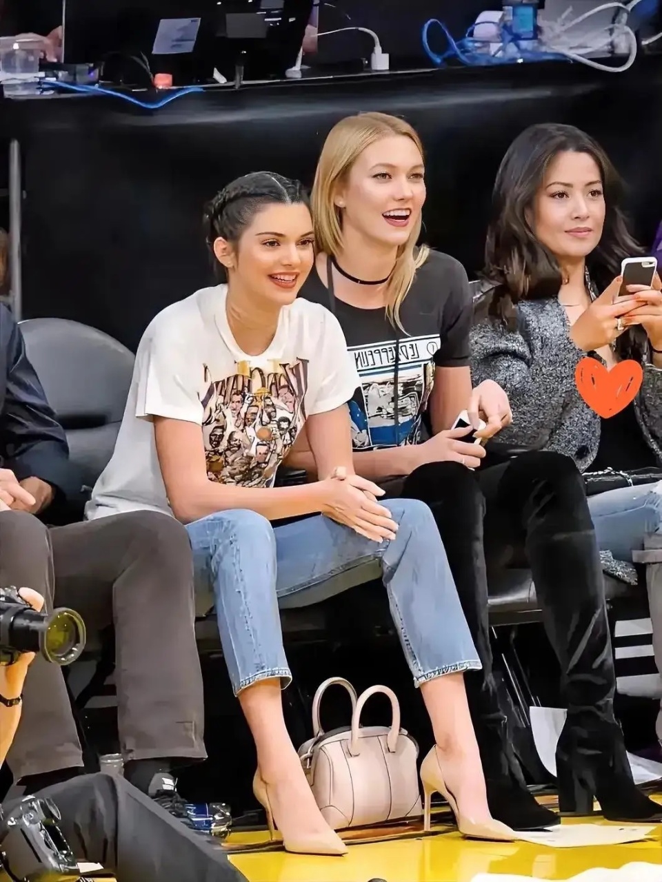肯达尔·詹娜那时候还顶着“卡戴珊小妹”的名头,穿着也特别接地气:一件印满图案的白T,配九分牛仔裤,脚踩裸色细高跟,头发简单编了两条小辫,人往场边一坐,整个人都是发光的!旁边是超模卡莉·克劳斯(KK),俩人同框,她的气场一点没输,反而有种毫不费力的时髦感。