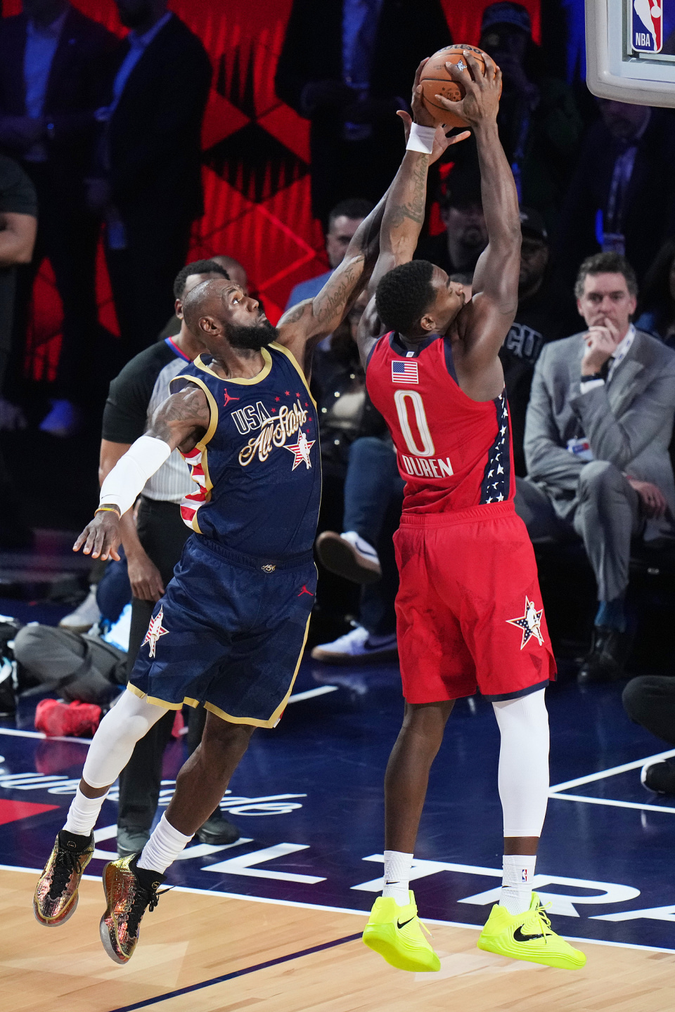 暂停回来,杰伦-约翰逊轰进三分,布克突破上篮,马克西助攻巴恩斯扣篮,此时星辰队领先到24分;布朗得分,霍姆格伦补篮,米切尔连续命中三分,但比赛早早失去悬念,最终星辰队47-21轻松击败条纹队,夺得2026年全明星正赛冠军。