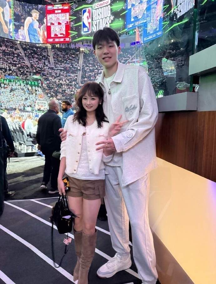此外,杨瀚森还参加了NBA新秀赛的比赛,他也在社交媒体上晒出了和女友在全明星期间的合影,女友依偎在小杨的怀中,小鸟依人的模样。