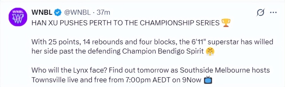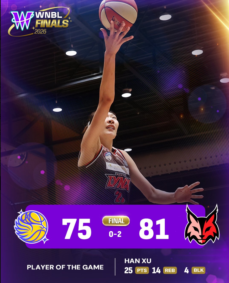 WNBL官方写道:韩旭帮助珀斯山猫夺得半决赛的胜利。这位身高6尺11寸的超级巨星贡献了25分14篮板4盖帽带领她的球队横扫卫冕冠军本迪戈精灵队。