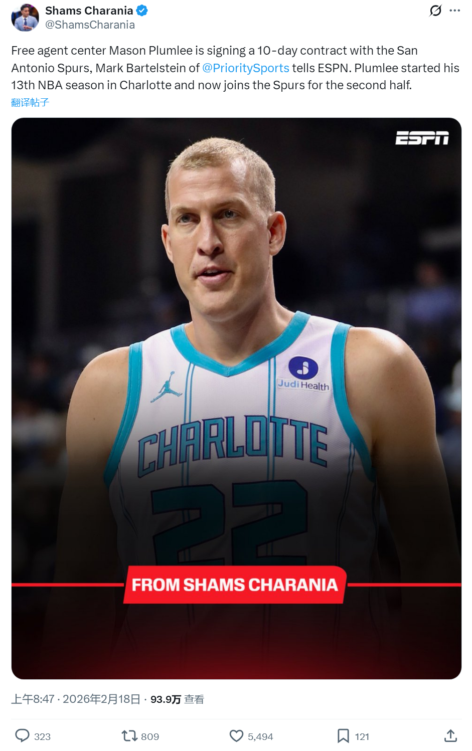 北京时间2月18日,据NBA名记Shams报道,中锋梅森-普拉姆利跟马刺签下一份10天合同。今年交易截止日之前,黄蜂把普拉姆利送到雷霆,1换2交易得到奥斯曼-吉昂和1个次轮签。为了给魔仙哥腾名额,雷霆很快裁掉普拉姆利。
