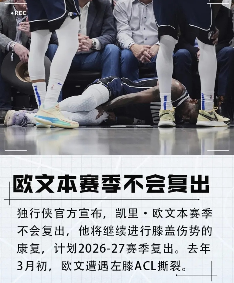 达拉斯独行侠官方今日宣布,球队核心后卫凯里欧文本赛季不会复出,他将继续进行膝盖伤势的康复,并计划于2026-27赛季回归赛场。如此一来,大家无比期待的凯里欧文+库珀弗拉格合体将不会发生在本赛季。