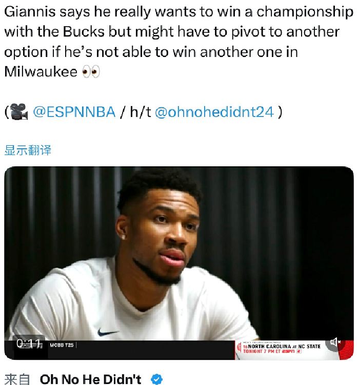 “如果雄鹿无法争冠或不想争冠,那我就会离开”,“要是我能够自行决定,也许早已离开了密尔沃基”......