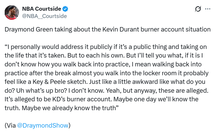 “所以如果是我,我会公开回应。但每个人处理方式不一样。不过说实话,如果真是他的小号,全明星假期后回去训练、走进更衣室,那场面估计会超级尴尬,气氛都不对了。当然,这些目前都只是传闻,只是说这个小号疑似属于杜兰特。也许有一天我们会知道真相,也许我们其实已经知道了,谁知道呢。”