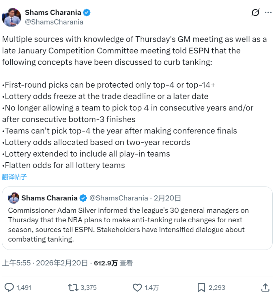 NBA官方计划推出多项新规,打击故意摆烂的球队:1、禁止球队连续两年获得前四顺位签;2、连续两年联盟倒数前三的球队不再获得高顺位签;3.打进分区决赛的球队,第二年不能获得前四顺位;4、根据两年的综合战绩,分配乐透抽签概率。